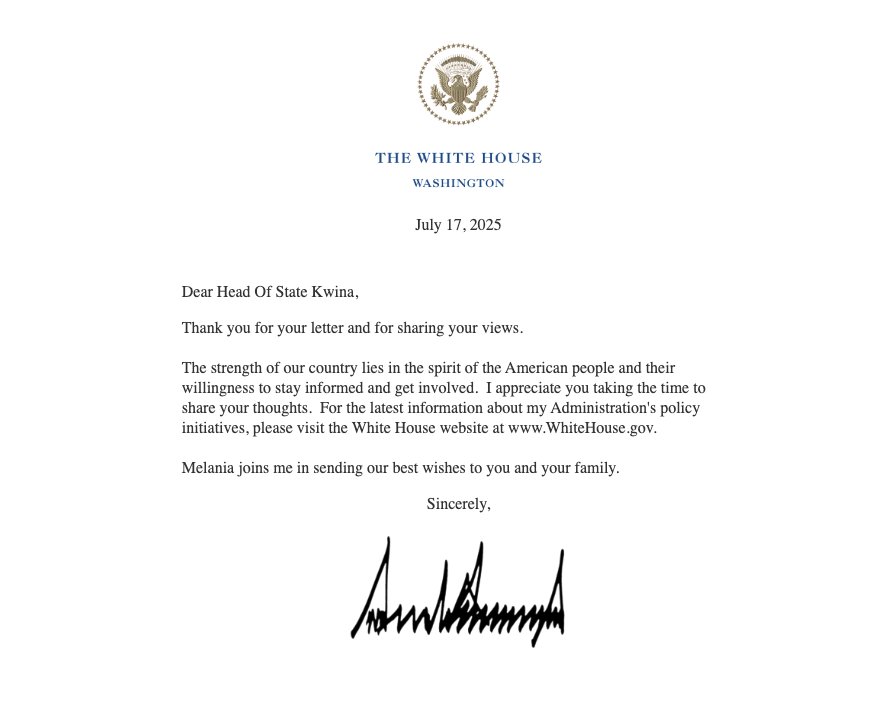 July 17, 2025 President Donald Trump wrote the Sovereign House of Kwina and the President acknowledged Head of State Kwina.