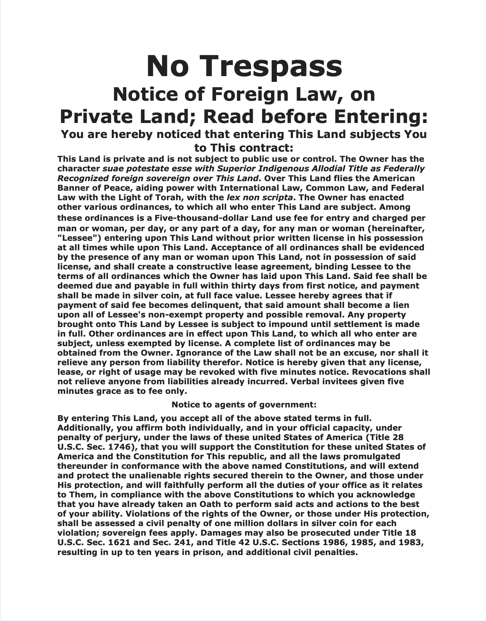 NOTICE OF FOREIGN LAW, ON PRIVATE LAND; READ BEFORE ENTERING